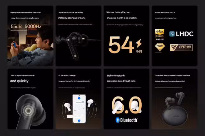 Oppo has increased battery capacity on the new model. The Enco Air5 Pro can deliver up to 13 hours of playback in AAC mode with active noise cancellation turned off. With the charging case, total battery life extends to 54 hours.